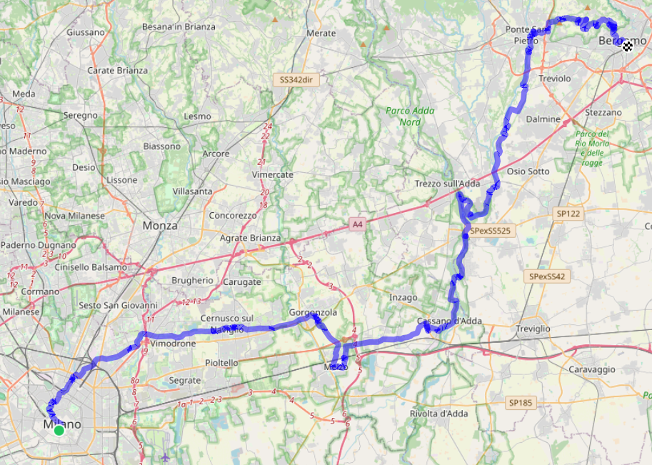 Questo percorso di 88 km, divisibile a piacere in diverse tappe, vi farà incontrare delle bellissime chiese, luoghi, moderni ed antichi e anche zone estremamente interessanti dal punto di vista naturalistico. Partendo dal centro di Milano si arriverà a Bergamo costeggiando il Naviglio Martesana e il fiume Brembo, fino ad arrivare alla città di Bergamo Alta