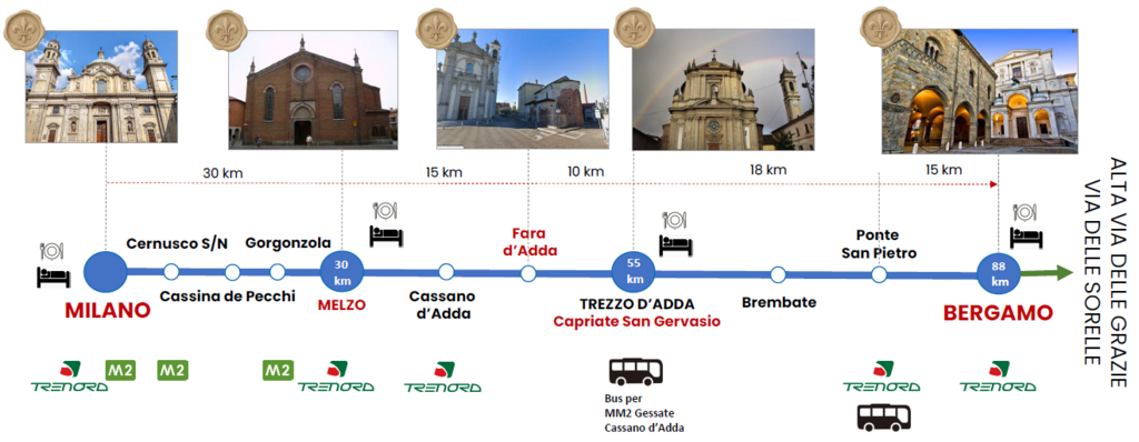 La Via di Sant'Alessandro è molto ben collegata lungo il suo percorso dalla fitta rete di trasporto lombarda sia milanese che bergamasca. In questo modo è sempre possibile tornare all'inizio della propria tappa e ritornare a casa specie quando si programma di svolgere il percorso in giorni non consecutivi.